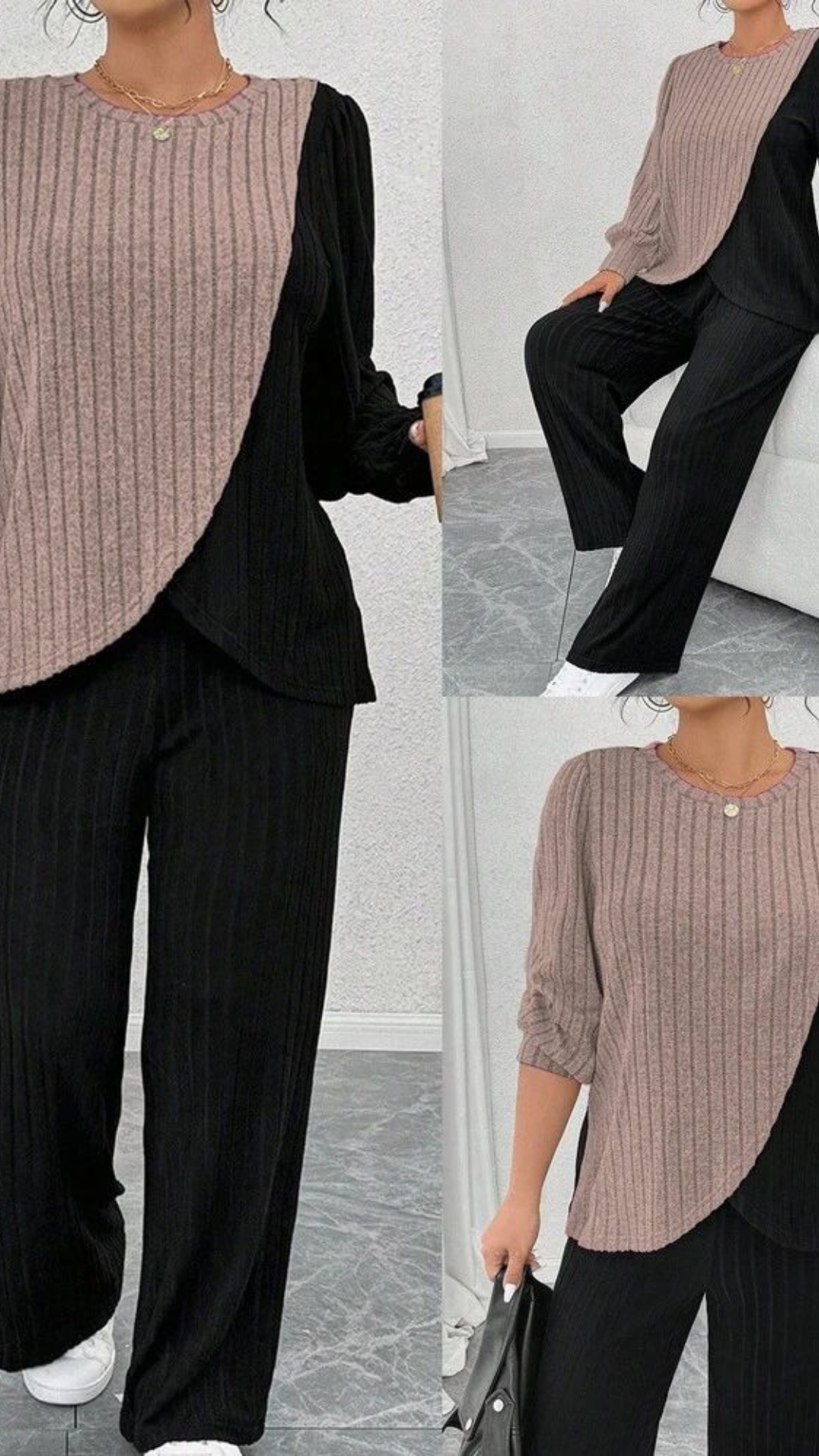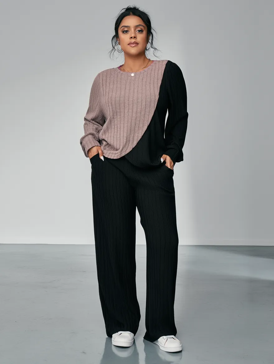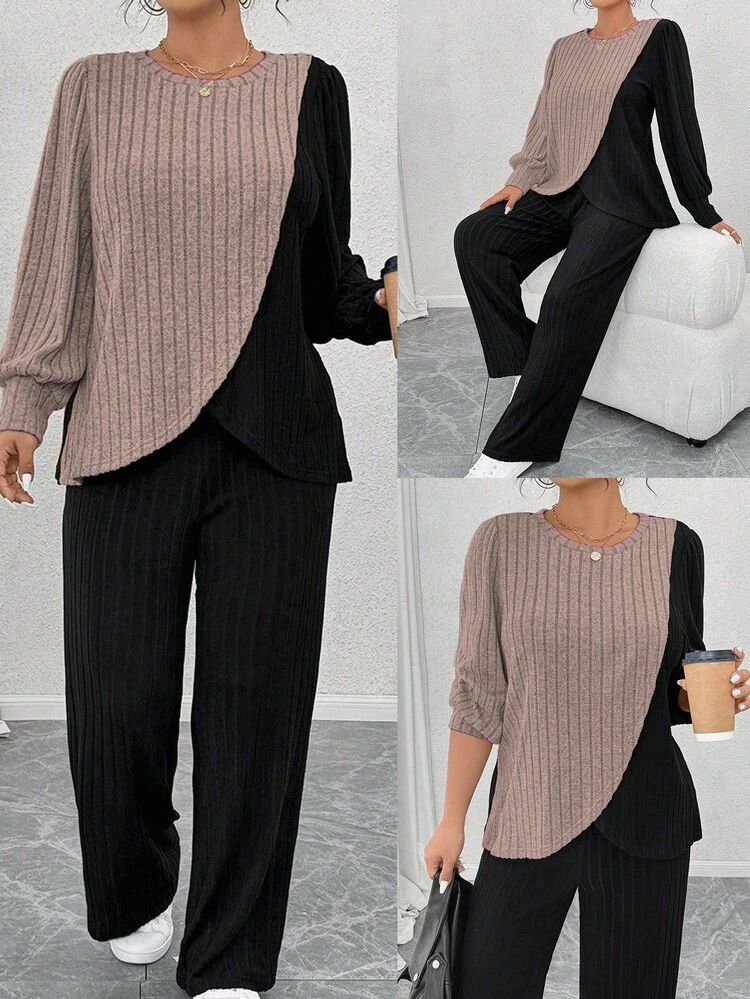 Cet ensemble deux pièces pour femme, composé d'un haut bicolore à manches longues et d'un pantalon assorti en maille côtelée, est vendu par le détaillant de mode en ligne SHEIN. Le vêtement est répertorié sur la version française du site sous le nom de ONEFYRA Ensemble De Haut Et Pantalon En Maille Côtelée Pour Femme Avec Épaules Tombantes".